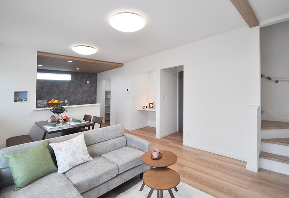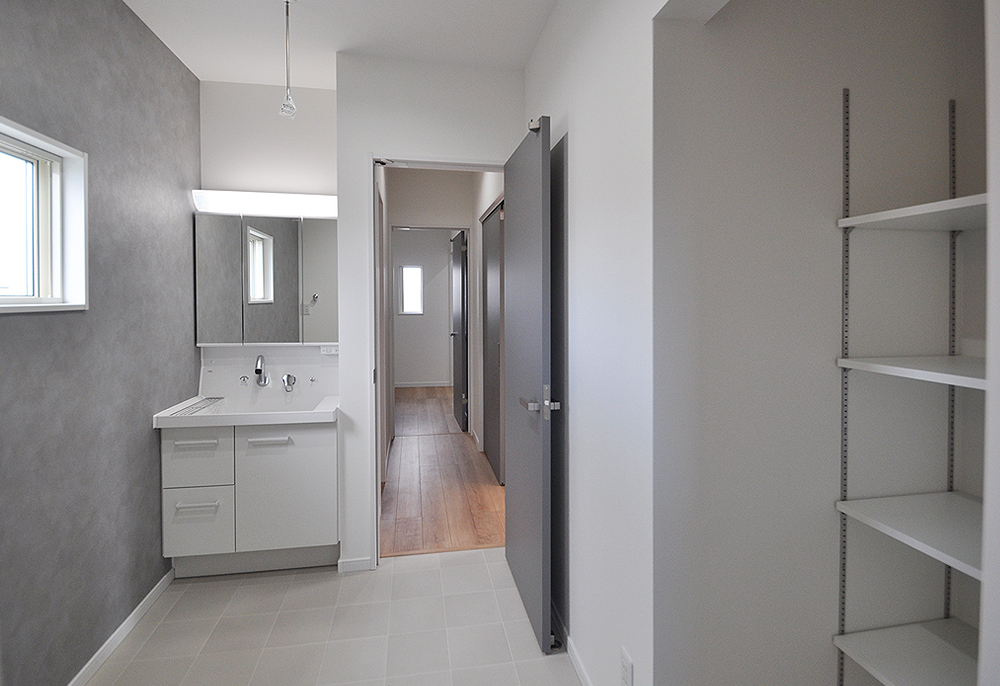 日当たり良好の角地53坪。シューズクロークと続きのファミリークローゼットは、ぐるりとリビングを通って一周できます。収納付の洗面脱衣室やリビングの書斎スペースもおすすめ。キッチン後方二ヵ所に食品庫、寝室から使える小窓のあるウォークインクローゼットなど収納も充実しています。