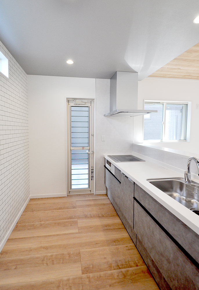 ゆったりとした吹抜けリビングは、キッチンから見渡せて家族のコミュニケーションが取りやすく、家事もしやすいのが特長です。シューズクロークからから続くファミリークローゼットはリビングに繋がっていてぐるりと一周できます。